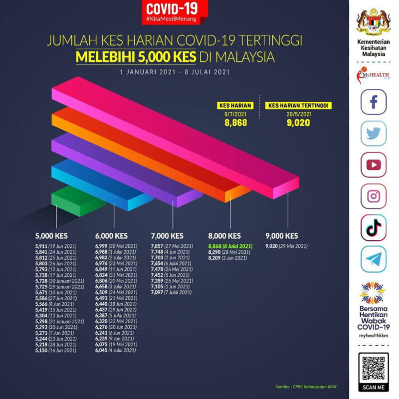 Seperti dilaporkan di laman rasmi Covid-19 Kementerian Kesihatan Malaysia (KKM), sehingga 8 Julai 2021: Jumlah kes COVID-19 yang dilaporkan adalah 8,868 kes. Angka ini merupakan kedua tertinggi yang pernah dicatatkan berbanding angka tertinggi pada 29 Mei lalu sebanyak 9,020 kes.