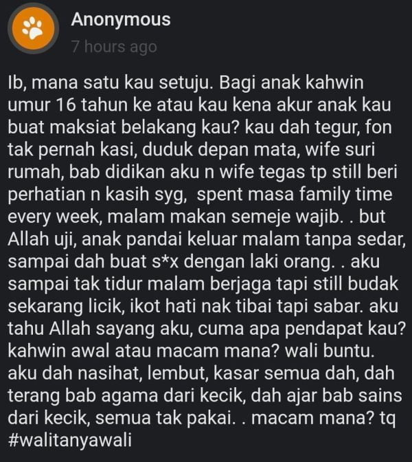 “Aku tahu Allah sayang aku, cuma apa pendapat kau? Bagi anak kahwin umur 16 tahun ke atau kena akur anak buat maksiat belakang kau?