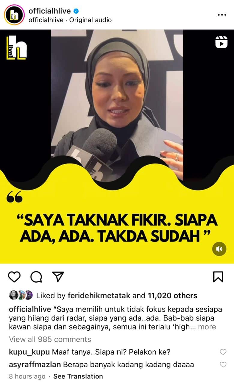 “You guys tahu i dah pernah kena Covid dua kali, jadi itu mungkin simptom-simptomnya, kita akan jadi pelupa. Mungkin saya yang tak ingat tapi saya memang tak tau dia siapa dan tak kenal dia,” katanya ketika menjawab soalan wartawan mengenai tindakannya meninggalkan komen di Instagram (IG) HLive yang menemubual Nad Zainal.