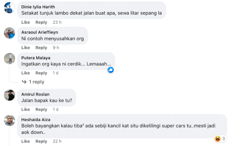 Mentang-mentang kaya, netizen menyumpah geng kerta mewah buat show sampai tutup laluan 4 lorong. Kira-kira lebih 10 supercars memenuhi sebuah lebuh raya untuk menghasilkan satu video konten sehingga mengundang rasa tidak puas hati dalam kalangan netizen.