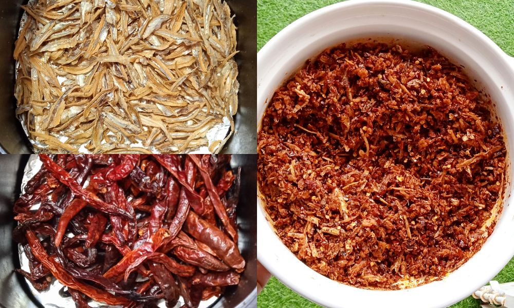 1. Ambil 2 mangkuk cili kering, cuci dan toskan, lepas tu letak dalam air fryer selama 10 minit pada suhu 150 darjah.