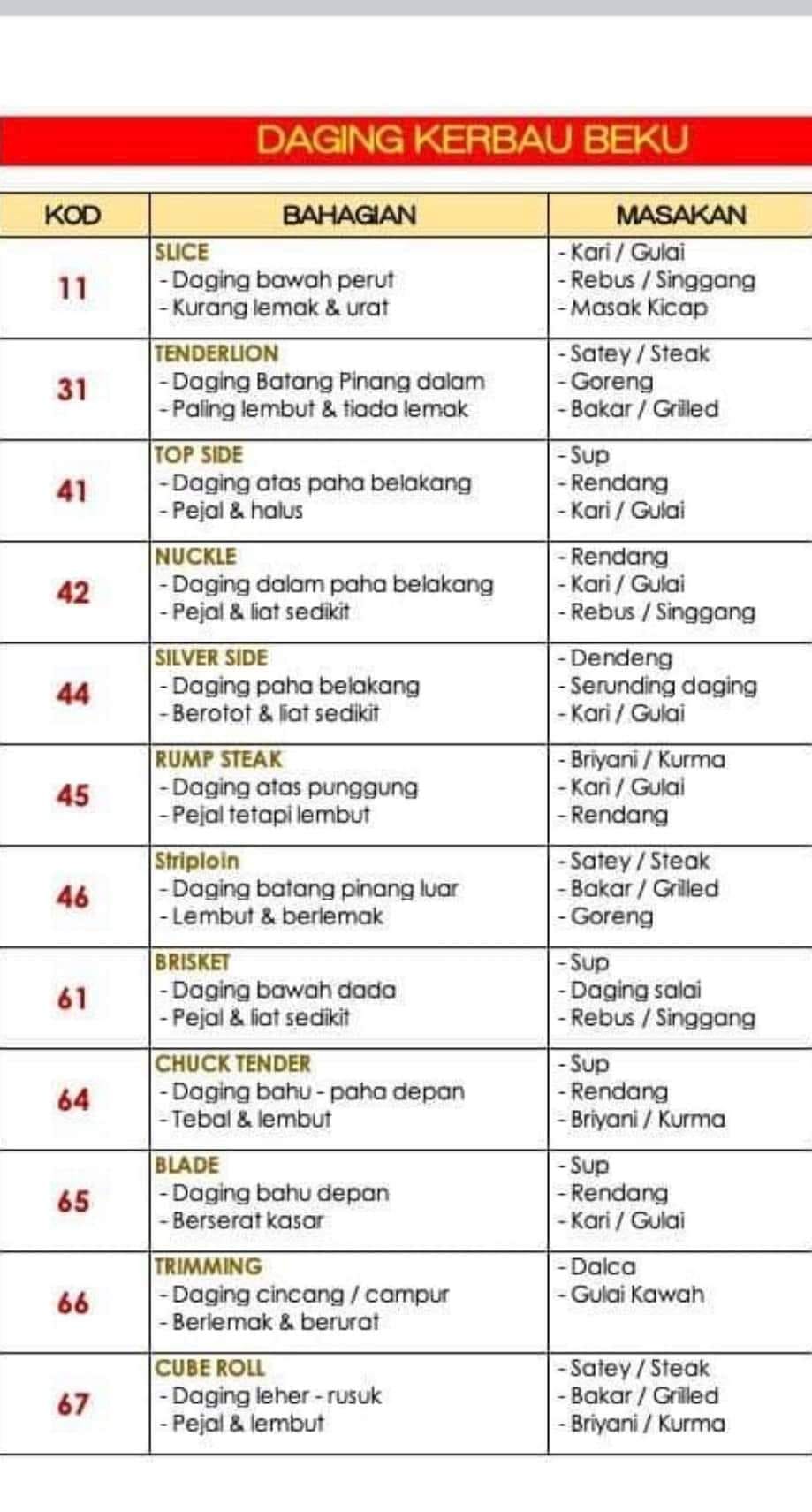 Menerusi hantaran di Facebook(Penjual Daging Baraqah Maju), pihaknya menjelaskan kod-kod yang ada pada bungkusan daging kerbau sejuk beku dan kesesuaian untuk masakan-masakan tertentu.