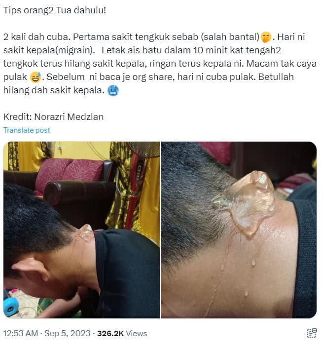 “Letak ais batu dalam 10 minit kat tengah-tengah tengkuk, hilang terus sakit kepala ni. Macam tak caya pulak.